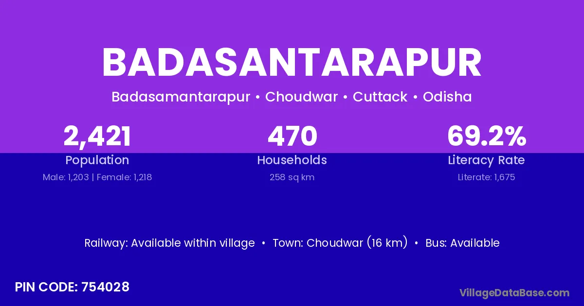 Choudwar (16 km) is the nearest town to Badasantarapur village for major economic activities and is located approximately 16 km away.