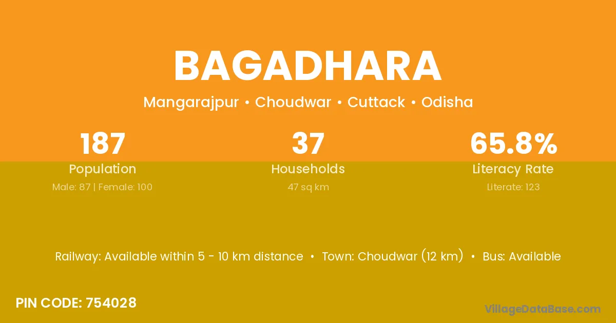 Choudwar (12 km) is the nearest town to Bagadhara village for major economic activities and is located approximately 12 km away.