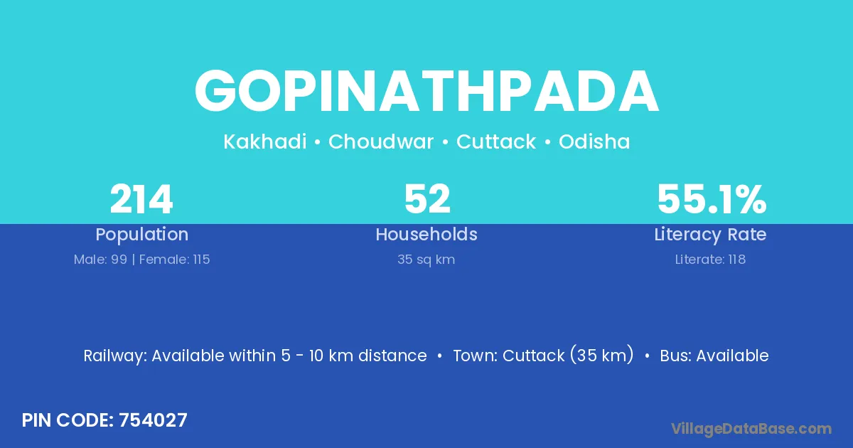 Cuttack (35 km) is the nearest town to Gopinathpada village for major economic activities and is located approximately 35 km away.