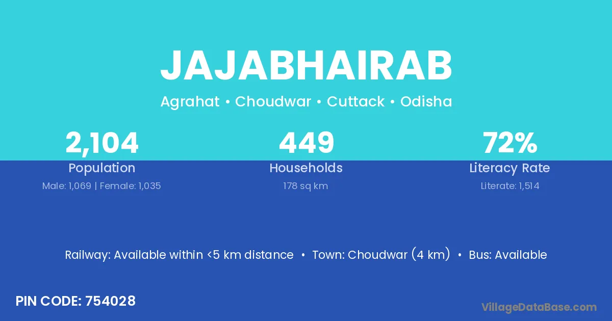 Choudwar (4 km) is the nearest town to Jajabhairab village for major economic activities and is located approximately 4 km away.