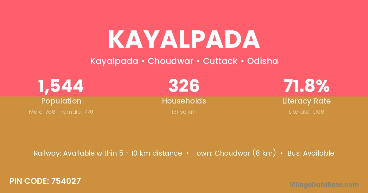 Choudwar (8 km) is the nearest town to Kayalpada village for major economic activities and is located approximately 8 km away.