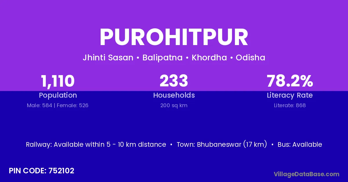 Choudwar (7 km) is the nearest town to Purohitpur village for major economic activities and is located approximately 7 km away.