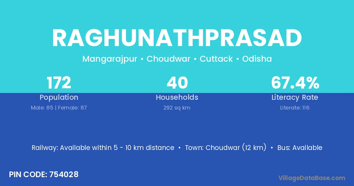 Choudwar (12 km) is the nearest town to Raghunathprasad village for major economic activities and is located approximately 12 km away.