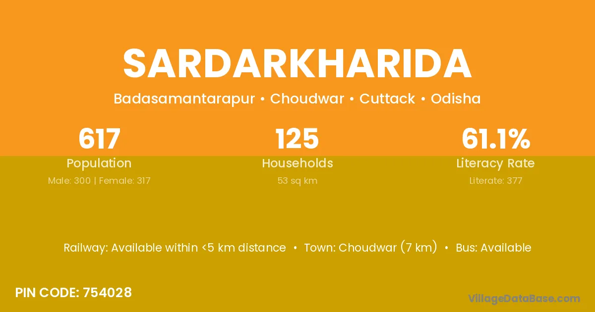 Sardarkharida village has a total population of 617 people, of which 300 are males and 317 are females.