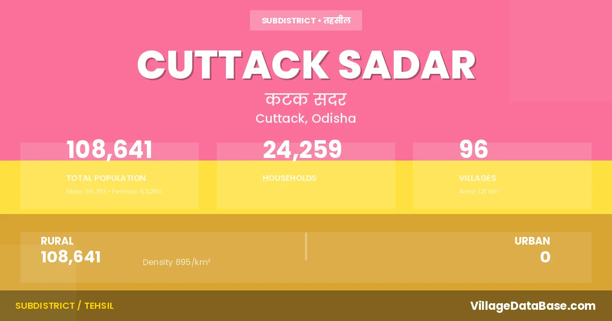 According to the 2011 census The total area of Cuttack Sadar Tehsil is 121 km², with a population of 108641 people. The population density is 895 inhabitants per square kilometre, and there are approximately 24259 houses in the sub district.