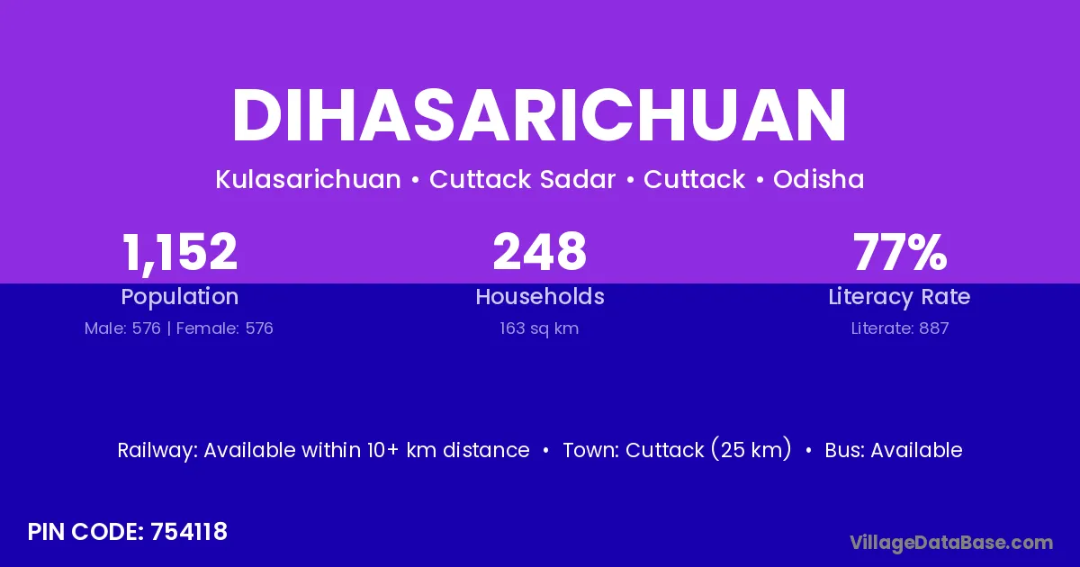 Cuttack (25 km) is the nearest town to Dihasarichuan village for major economic activities and is located approximately 25 km away.