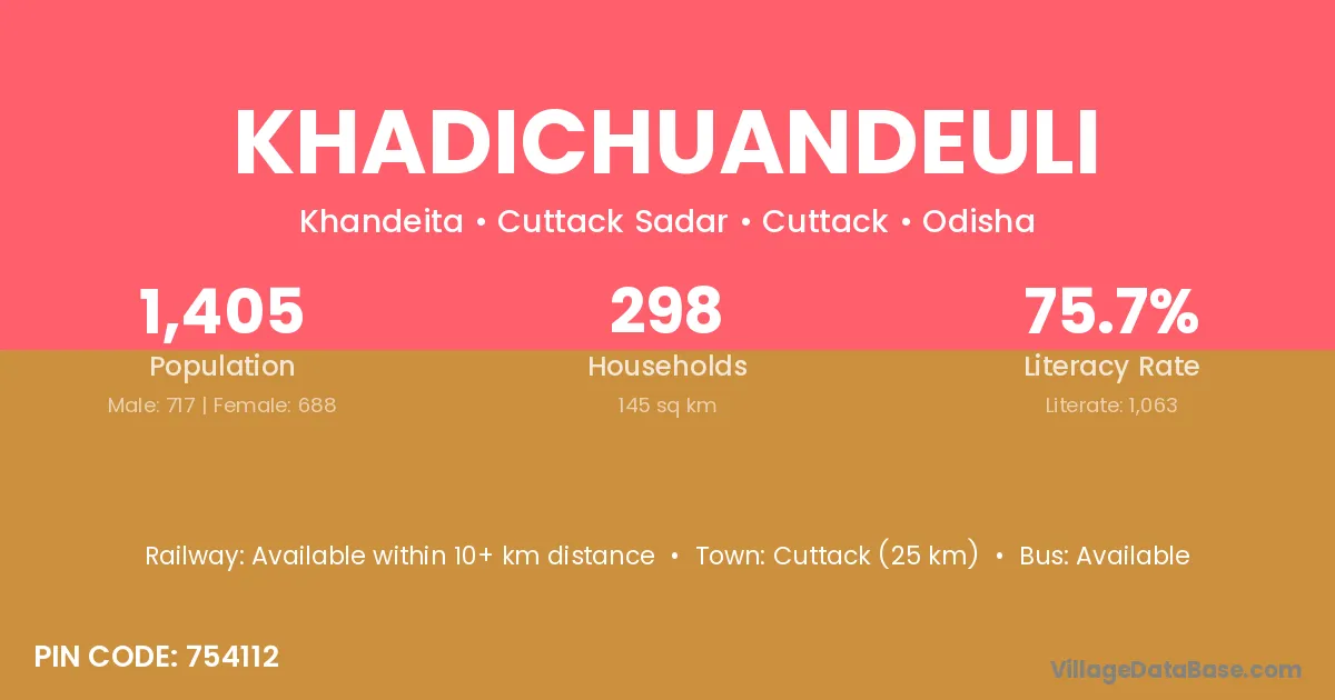 Cuttack (25 km) is the nearest town to Khadichuandeuli village for major economic activities and is located approximately 25 km away.