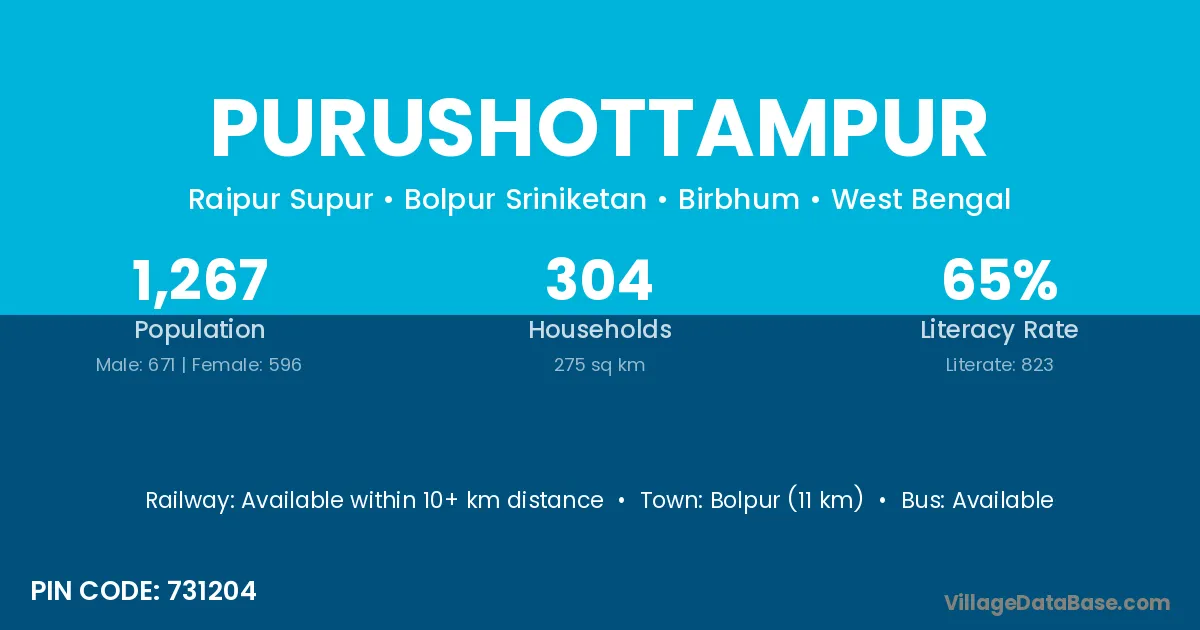 The literacy rate of Purushottampur village is 68.42%. Male literacy stands at 76.55% and female literacy at 60.27%.