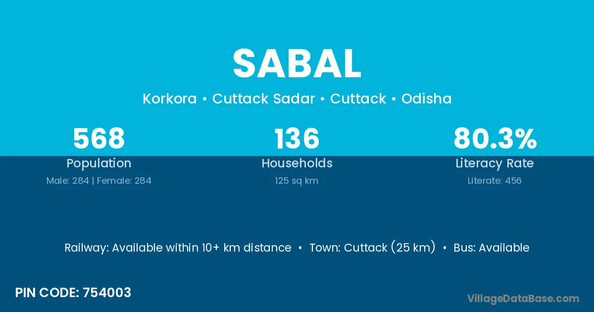Cuttack (25 km) is the nearest town to Sabal village for major economic activities and is located approximately 25 km away.