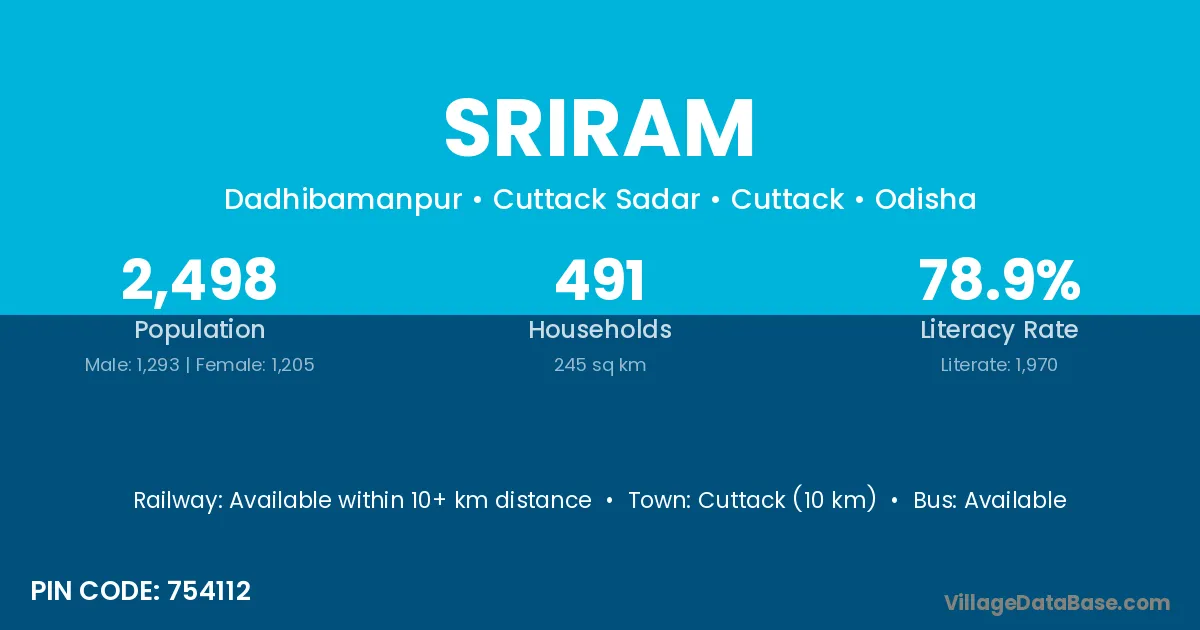 Cuttack (10 km) is the nearest town to Sriram village for major economic activities and is located approximately 10 km away.
