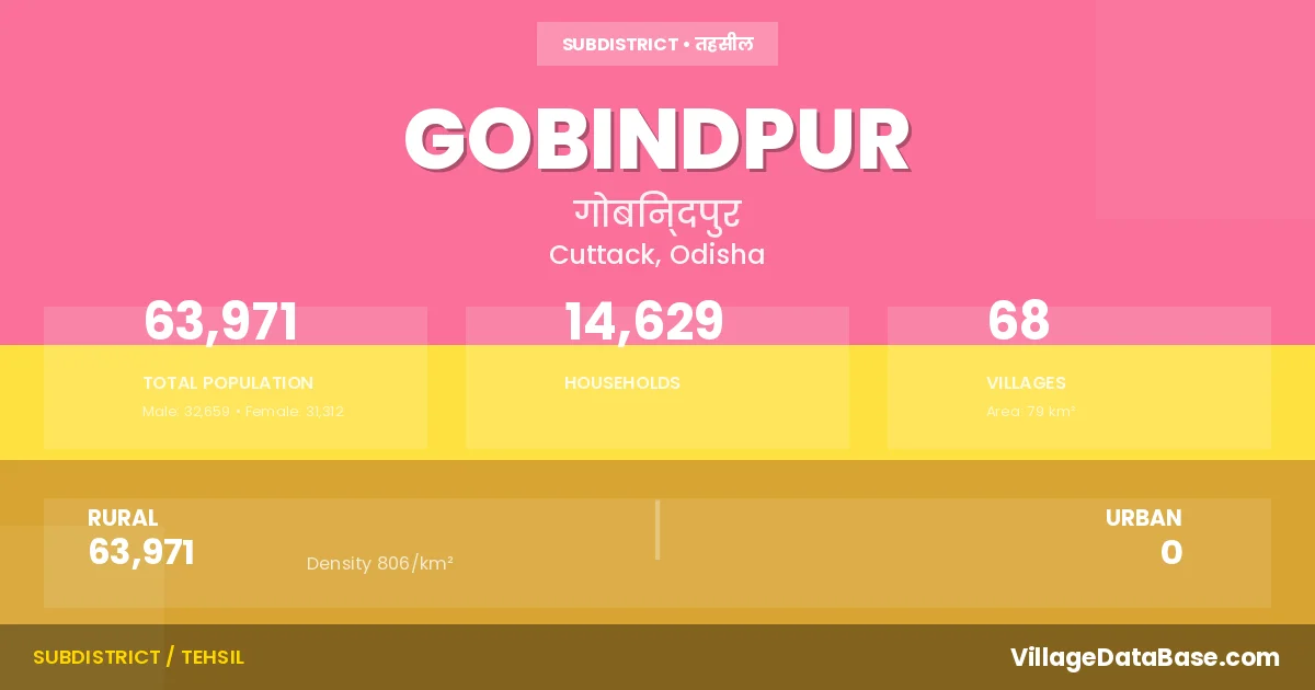 Gobindpur is a town and Tehsil in the Cuttack district of the Odisha. In India, a Tehsil is a subdivision of a district responsible for the administration and revenue collection of a specific area within the district. Tehsils play a crucial role in the local governance structure, contributing significantly to the development and administration of their communities.