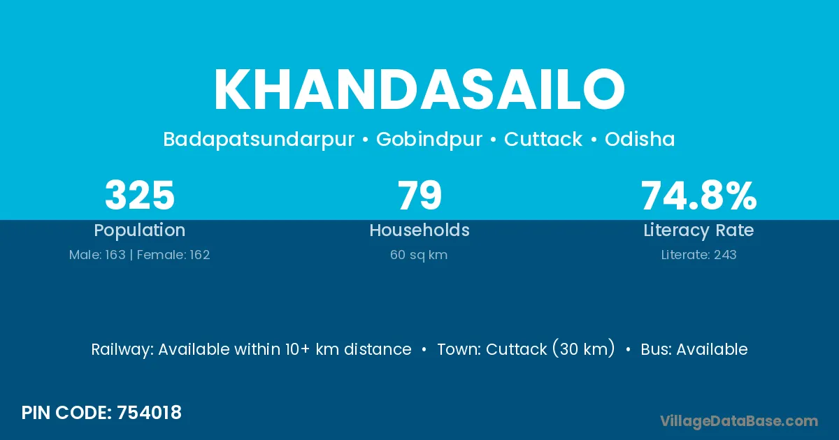 The literacy rate of Khandasailo village is 74.77%. Male literacy stands at 78.53% and female literacy at 70.99%.