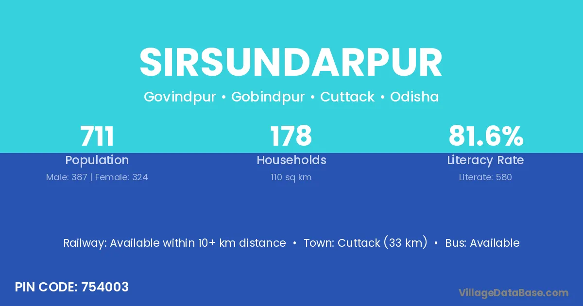 Cuttack (33 km) is the nearest town to Sirsundarpur village for major economic activities and is located approximately 33 km away.