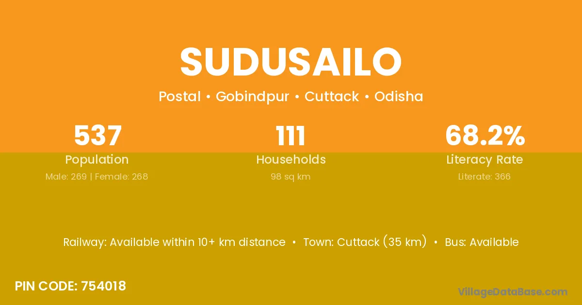 Cuttack (35 km) is the nearest town to Sudusailo village for major economic activities and is located approximately 35 km away.