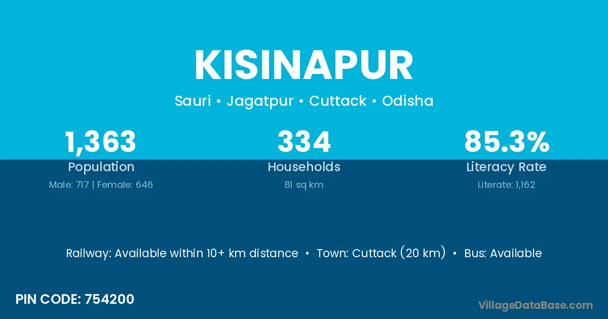 Cuttack (20 km) is the nearest town to Kisinapur village for major economic activities and is located approximately 20 km away.