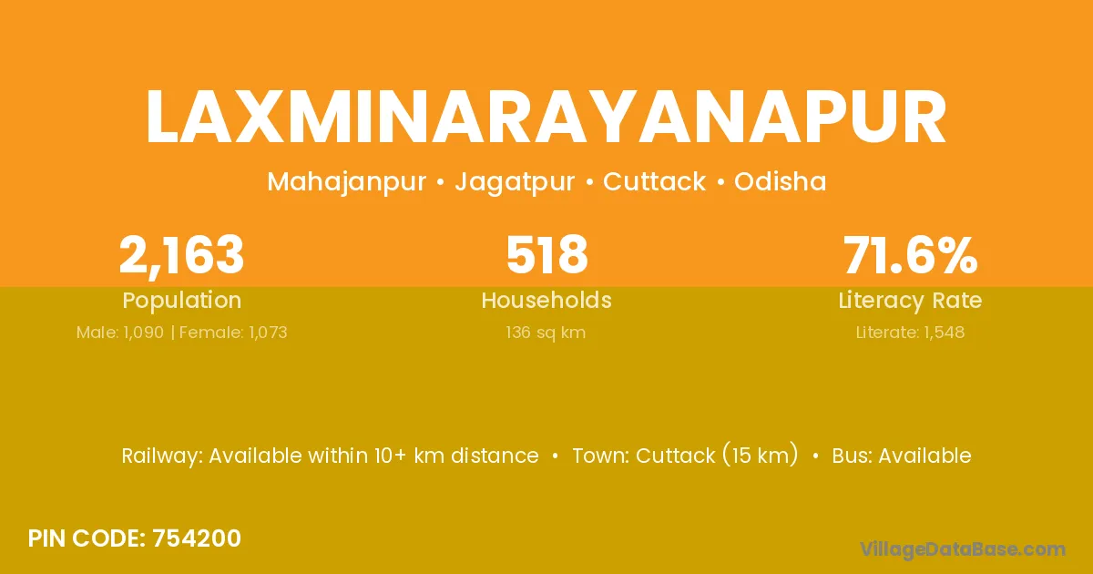 Cuttack (15 km) is the nearest town to Laxminarayanapur village for major economic activities and is located approximately 15 km away.