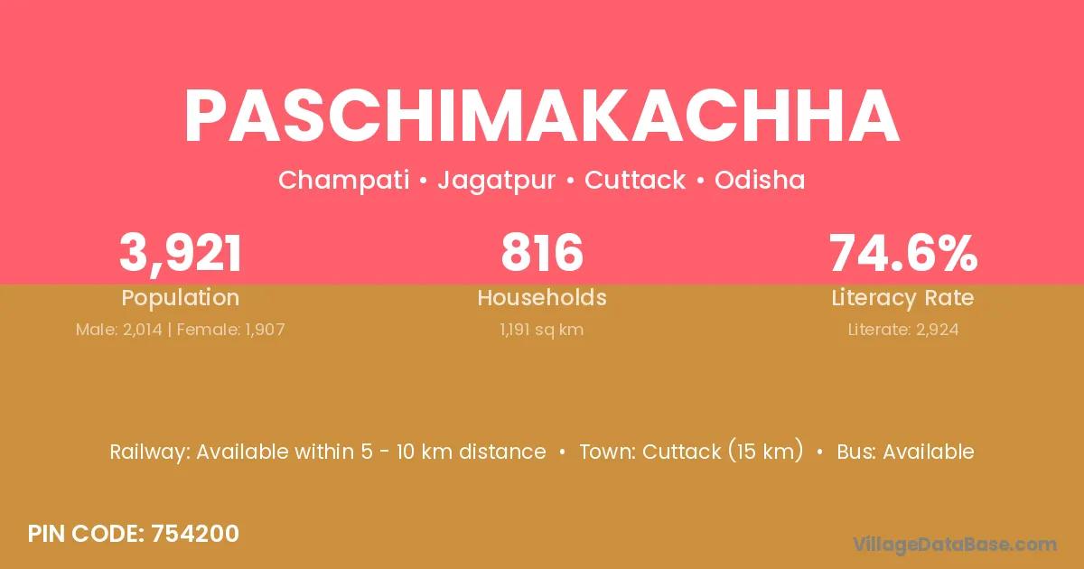 Cuttack (15 km) is the nearest town to Paschimakachha village for major economic activities and is located approximately 15 km away.