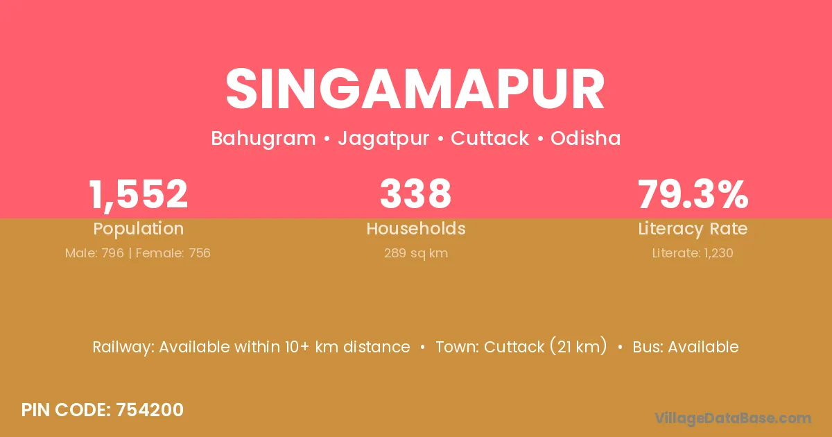 Cuttack (21 km) is the nearest town to Singamapur village for major economic activities and is located approximately 21 km away.