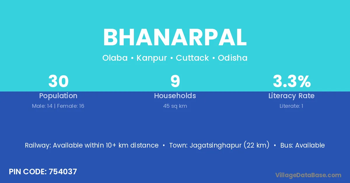 Jagatsinghapur (22 km) is the nearest town to Bhanarpal village for major economic activities and is located approximately 22 km away.