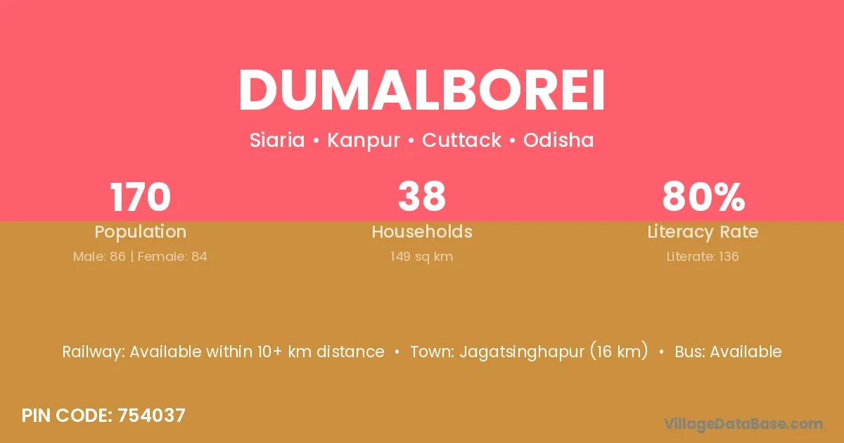 Jagatsinghapur (16 km) is the nearest town to Dumalborei village for major economic activities and is located approximately 16 km away.