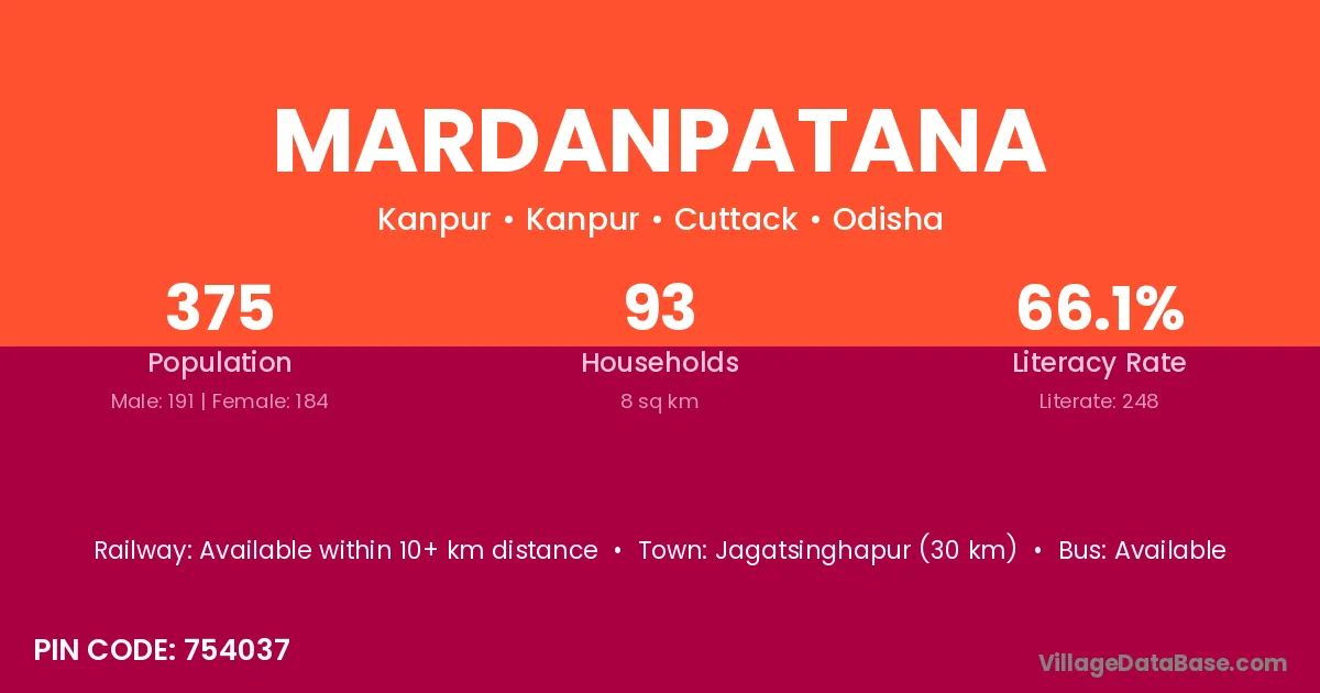 Jagatsinghapur (30 km) is the nearest town to Mardanpatana village for major economic activities and is located approximately 30 km away.