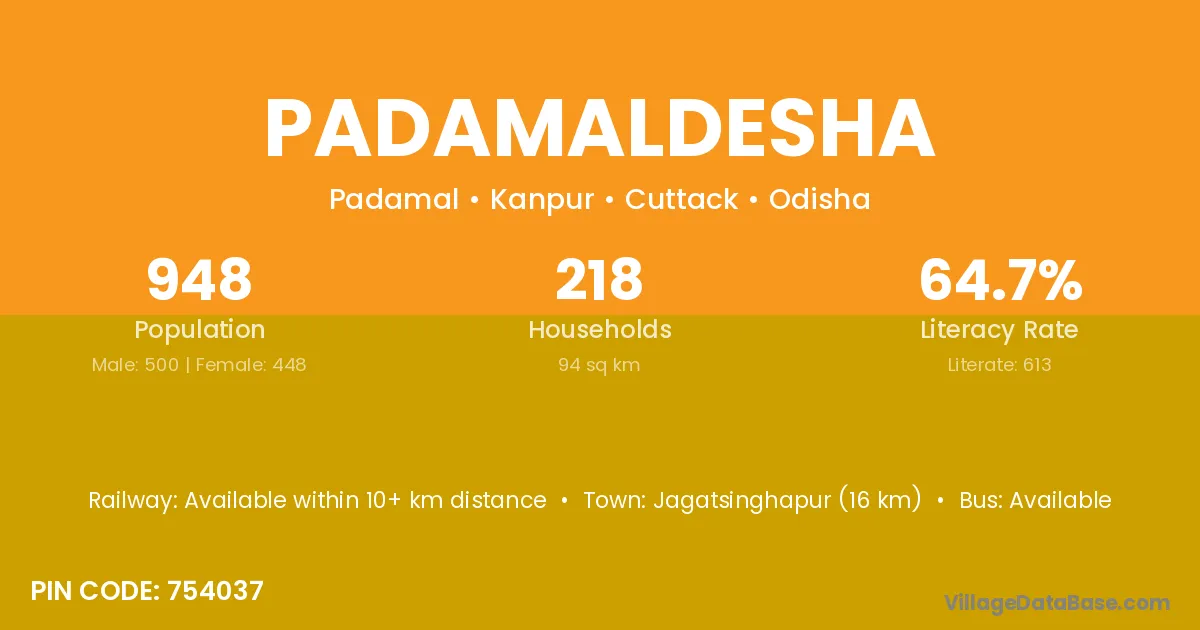 Jagatsinghapur (16 km) is the nearest town to Padamaldesha village for major economic activities and is located approximately 16 km away.