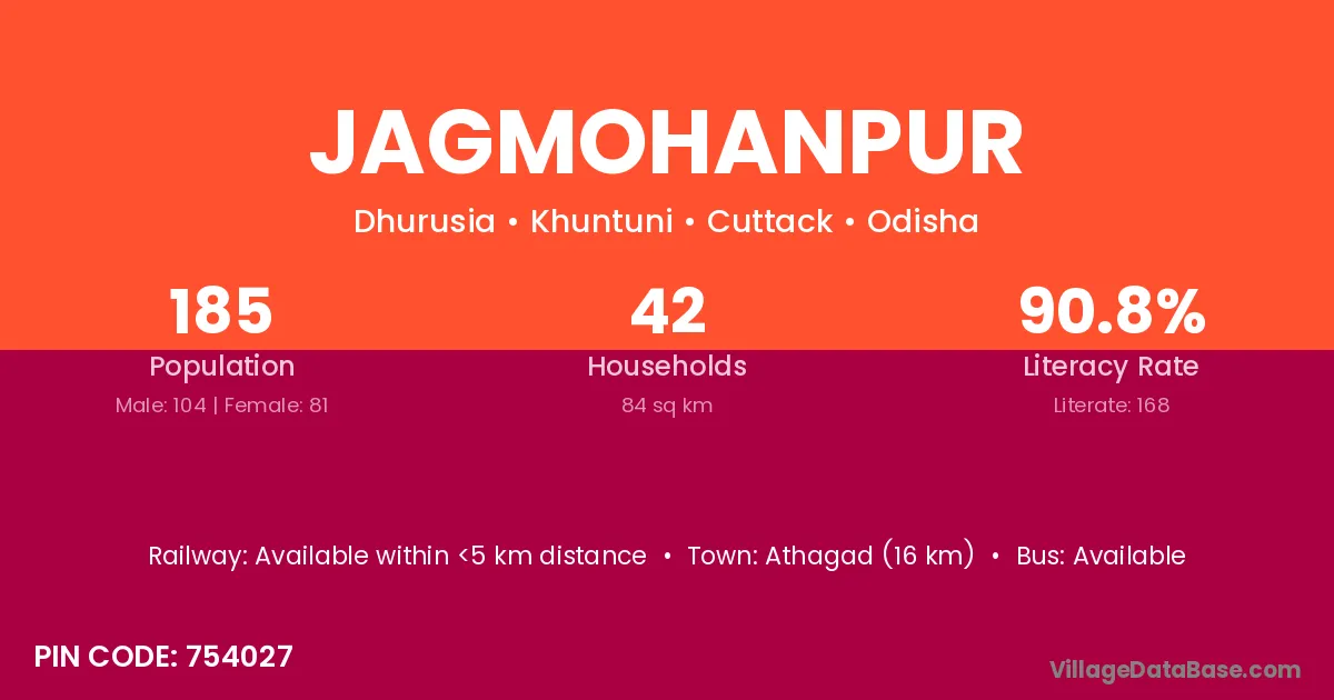 Athagad (16 km) is the nearest town to Jagmohanpur village for major economic activities and is located approximately 16 km away.