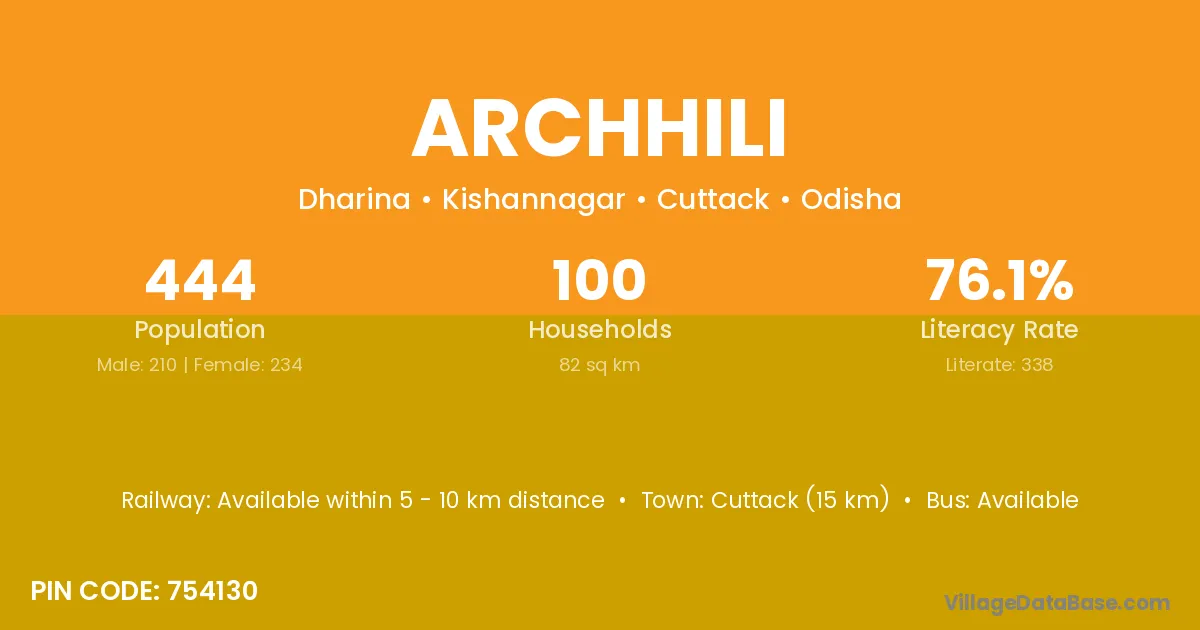 Cuttack (15 km) is the nearest town to Archhili village for major economic activities and is located approximately 15 km away.