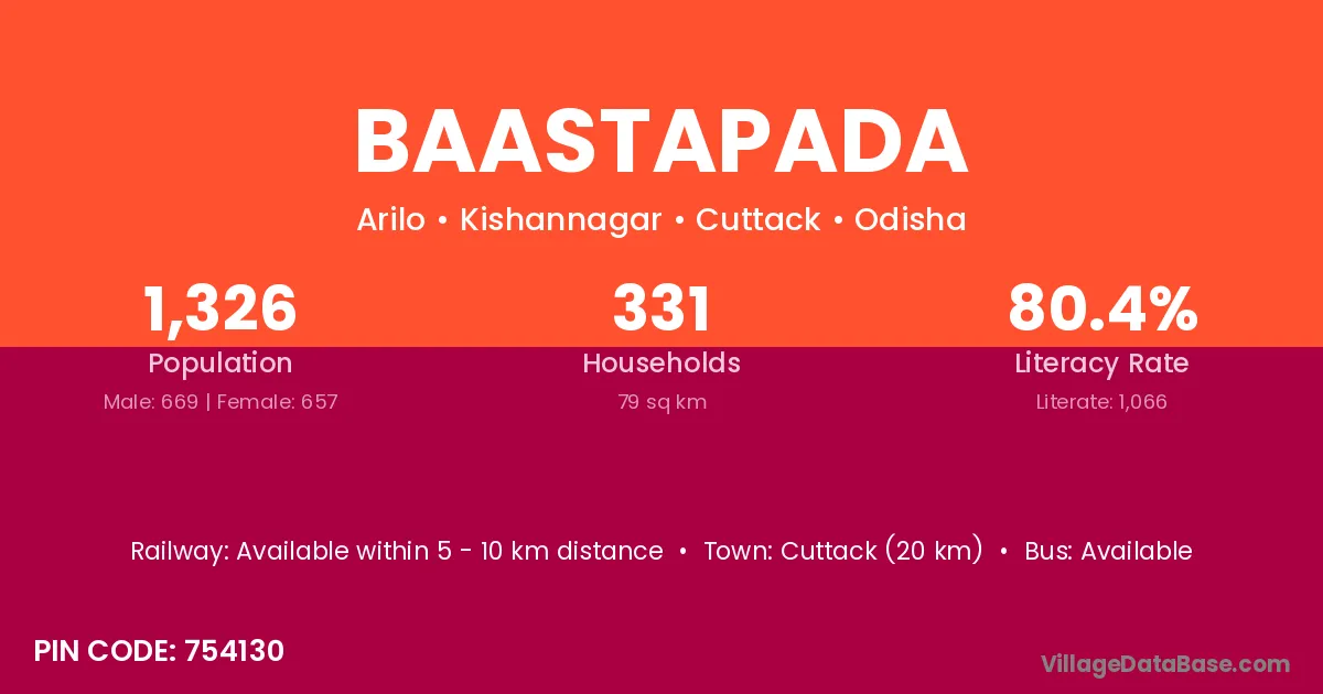 Cuttack (20 km) is the nearest town to Baastapada village for major economic activities and is located approximately 20 km away.