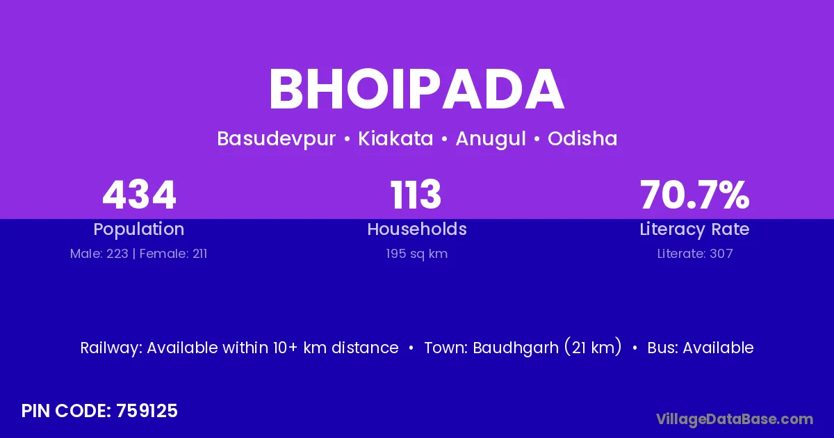 The literacy rate of Bhoipada village is 62.50%. Male literacy stands at 69.80% and female literacy at 54.03%.