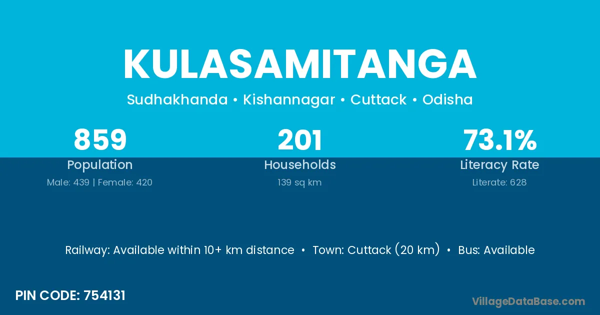 Cuttack (20 km) is the nearest town to Kulasamitanga village for major economic activities and is located approximately 20 km away.