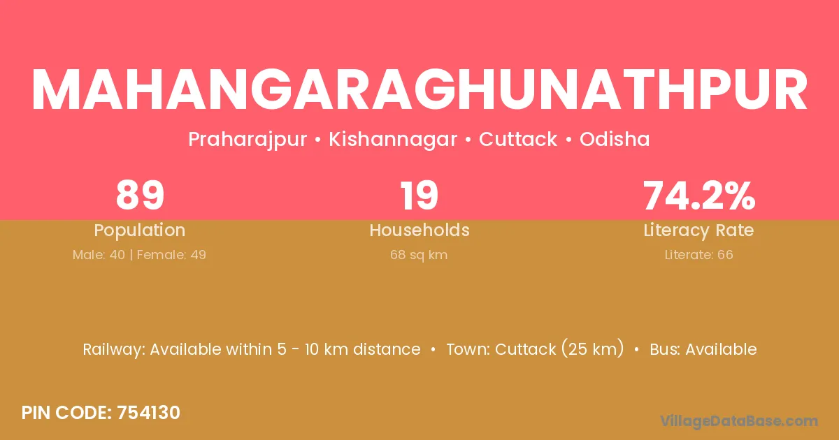 Cuttack (25 km) is the nearest town to Mahangaraghunathpur village for major economic activities and is located approximately 25 km away.