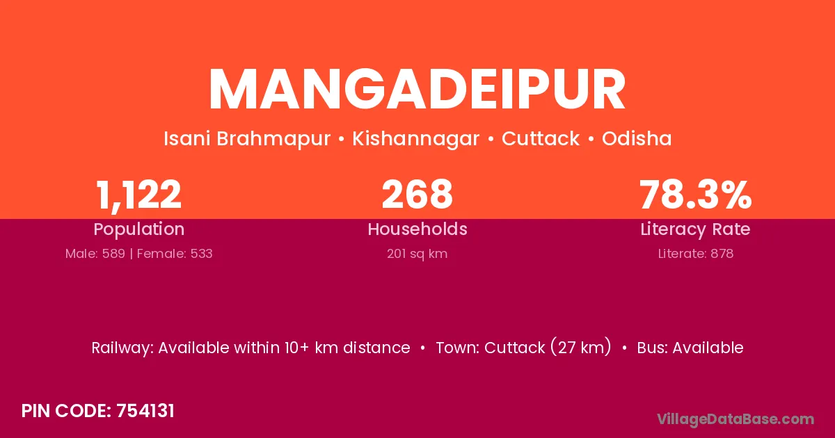 Cuttack (27 km) is the nearest town to Mangadeipur village for major economic activities and is located approximately 27 km away.