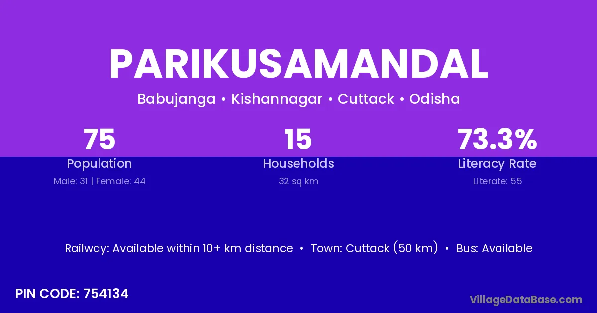 Cuttack (50 km) is the nearest town to Parikusamandal village for major economic activities and is located approximately 50 km away.