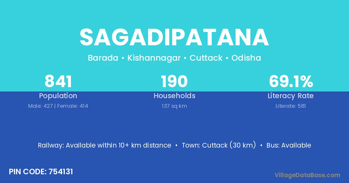 Cuttack (30 km) is the nearest town to Sagadipatana village for major economic activities and is located approximately 30 km away.