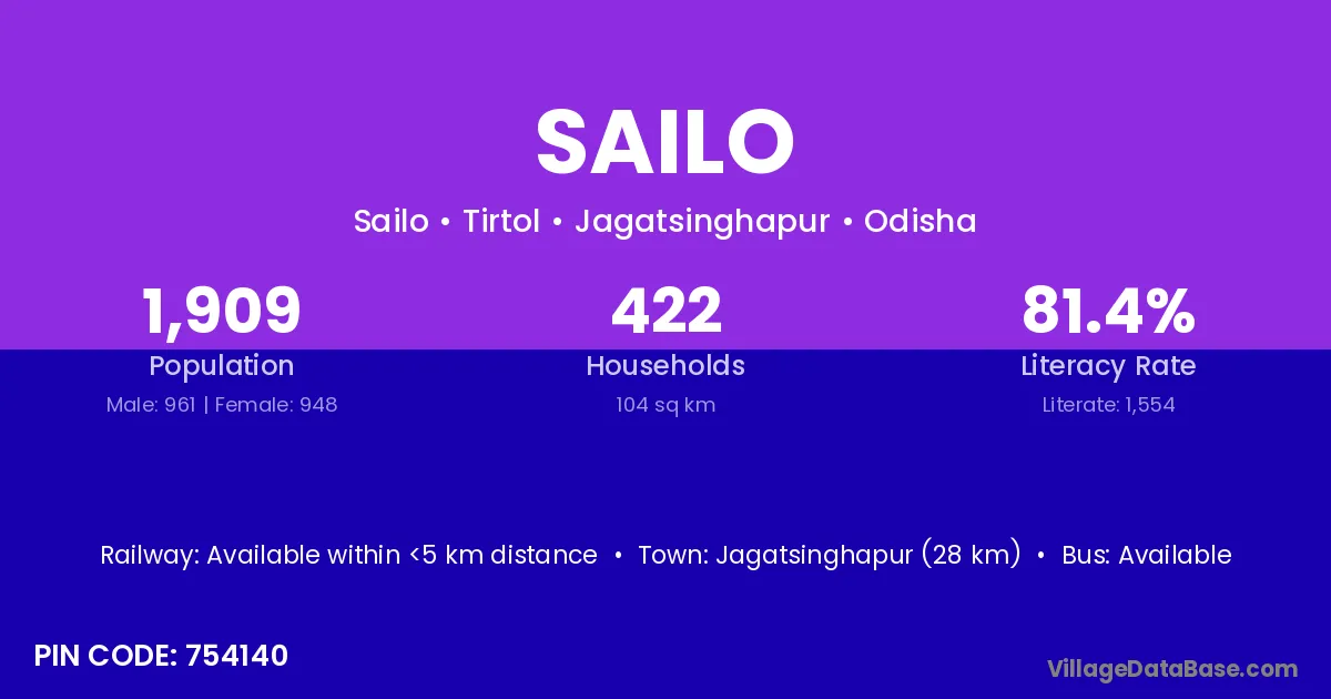 Cuttack (25 km) is the nearest town to Sailo village for major economic activities and is located approximately 25 km away.