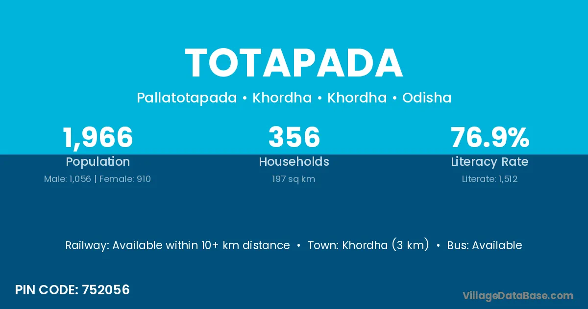 Cuttack (20 km) is the nearest town to Totapada village for major economic activities and is located approximately 20 km away.