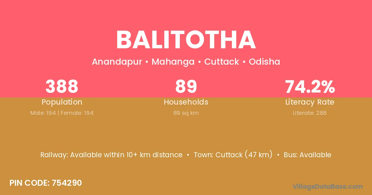 Balitotha village has a total population of 388 people, of which 194 are males and 194 are females.