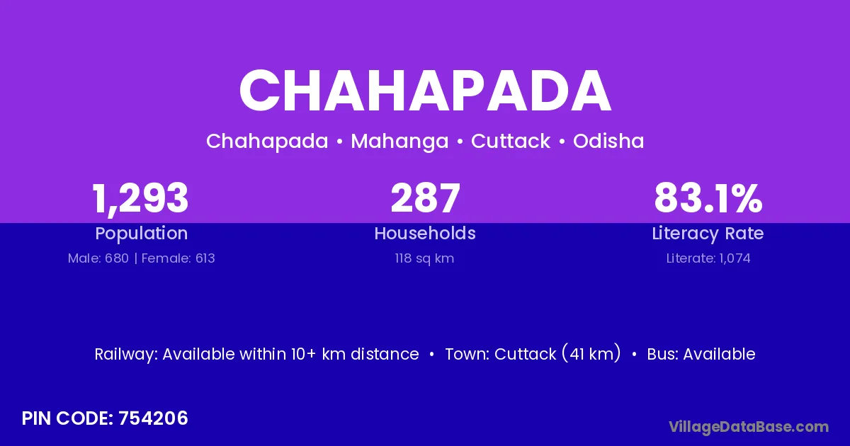 Cuttack (41 km) is the nearest town to Chahapada village for major economic activities and is located approximately 41 km away.