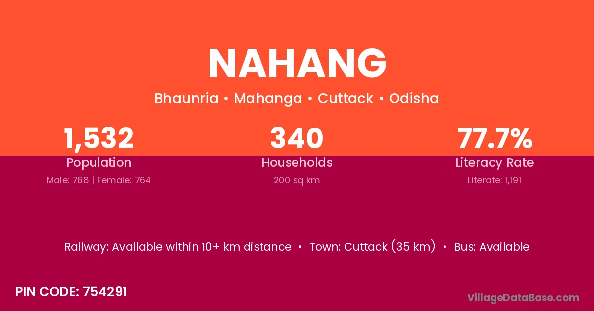 Cuttack (35 km) is the nearest town to Nahang village for major economic activities and is located approximately 35 km away.