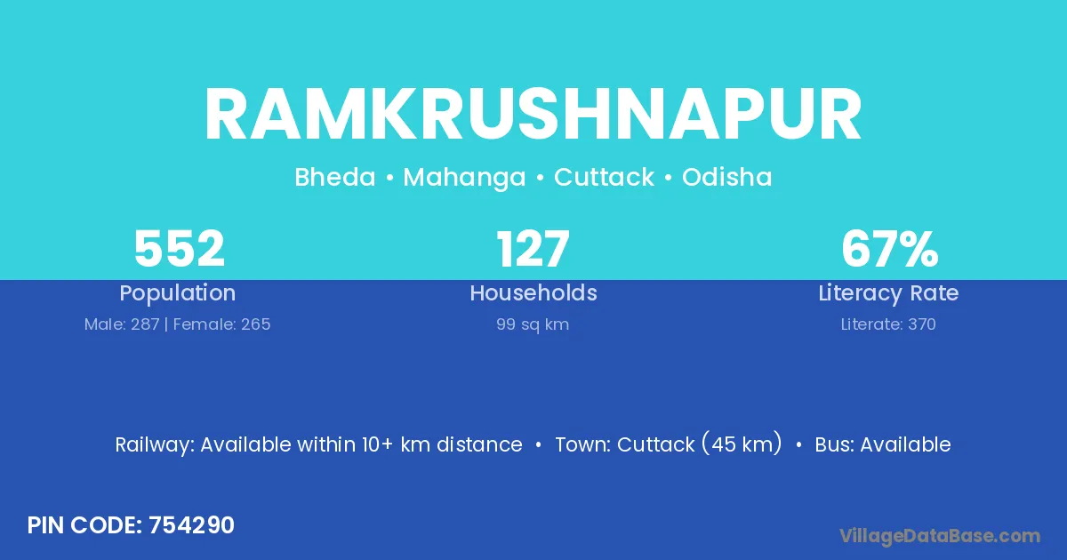 Cuttack (45 km) is the nearest town to Ramkrushnapur village for major economic activities and is located approximately 45 km away.