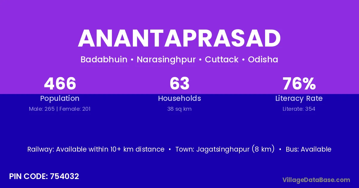 Jagatsinghapur (8 km) is the nearest town to Anantaprasad village for major economic activities and is located approximately 8 km away.