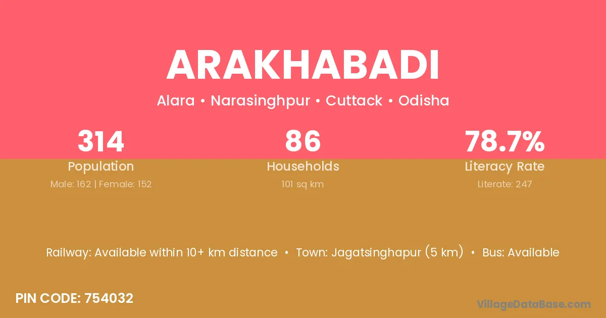Jagatsinghapur (5 km) is the nearest town to Arakhabadi village for major economic activities and is located approximately 5 km away.