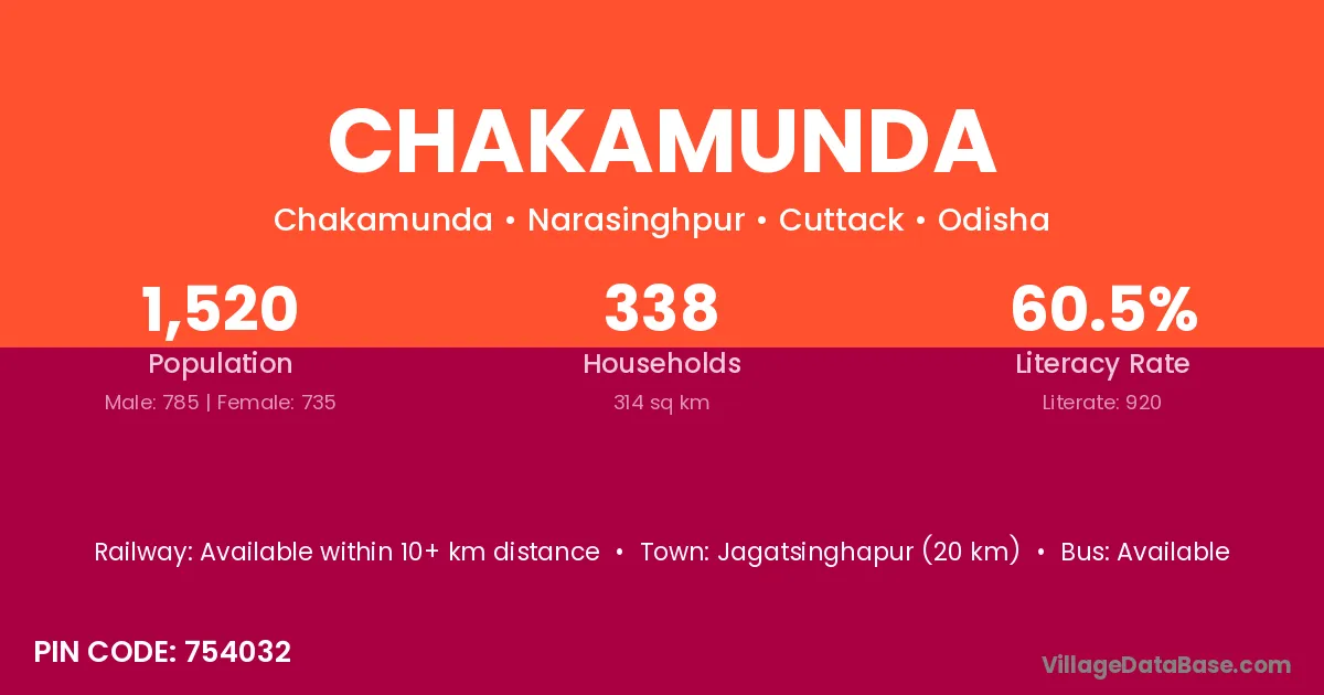 Jagatsinghapur (20 km) is the nearest town to Chakamunda village for major economic activities and is located approximately 20 km away.
