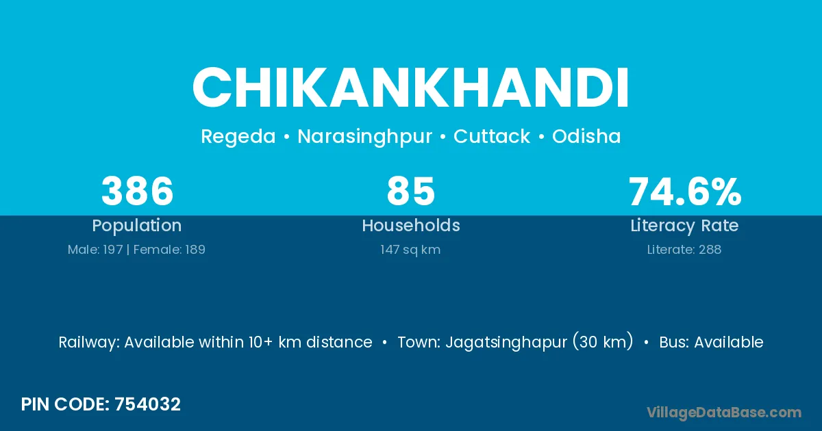 Jagatsinghapur (30 km) is the nearest town to Chikankhandi village for major economic activities and is located approximately 30 km away.
