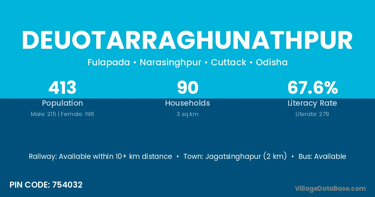 Jagatsinghapur (2 km) is the nearest town to Deuotarraghunathpur village for major economic activities and is located approximately 2 km away.