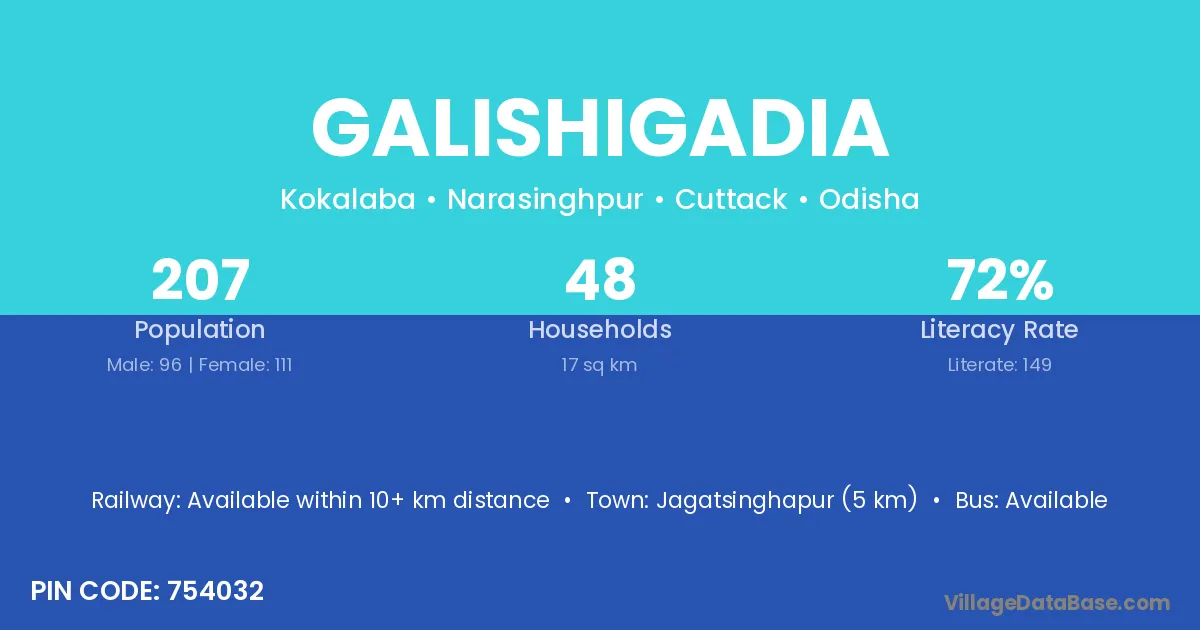 Jagatsinghapur (5 km) is the nearest town to Galishigadia village for major economic activities and is located approximately 5 km away.