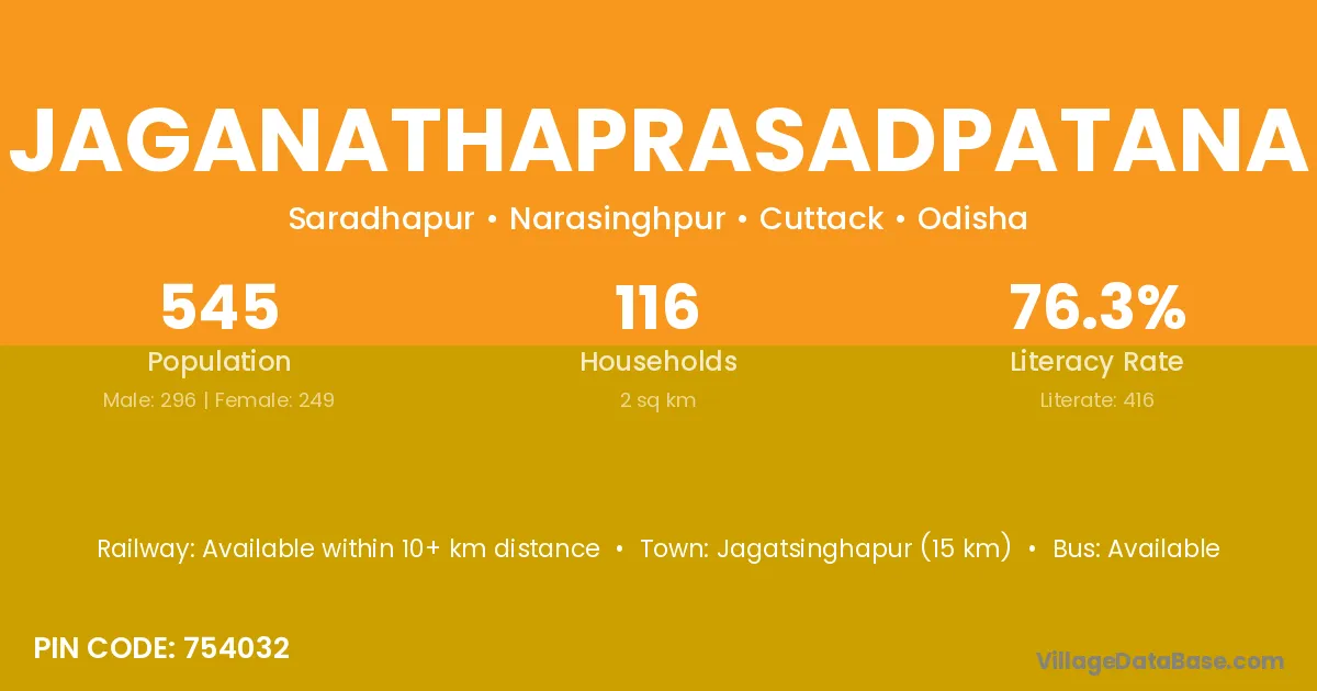 Jaganathaprasadpatana village has a total population of 545 people, of which 296 are males and 249 are females.