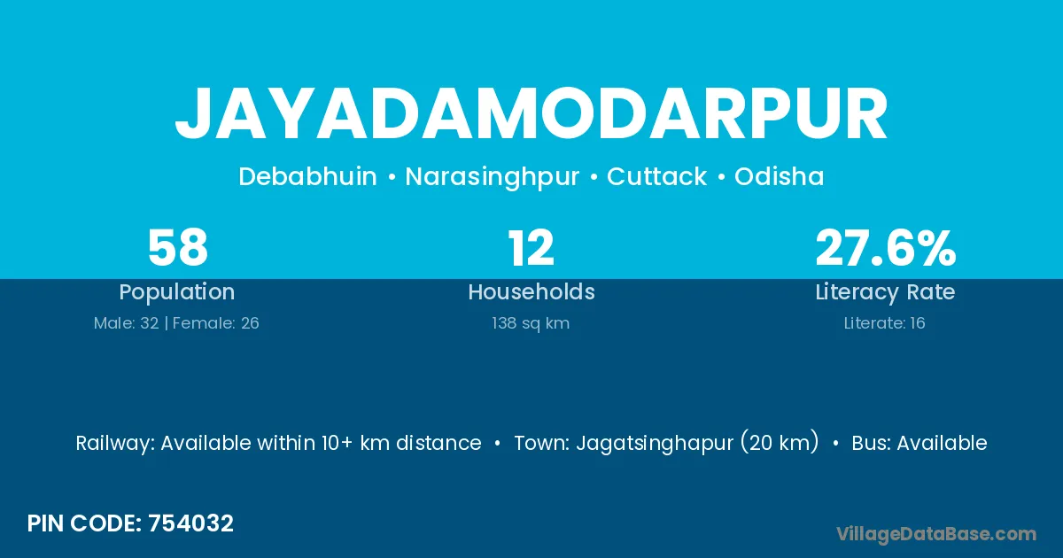 Jagatsinghapur (20 km) is the nearest town to Jayadamodarpur village for major economic activities and is located approximately 20 km away.