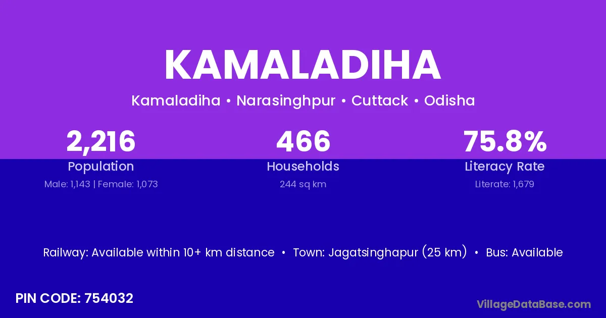 Jagatsinghapur (25 km) is the nearest town to Kamaladiha village for major economic activities and is located approximately 25 km away.